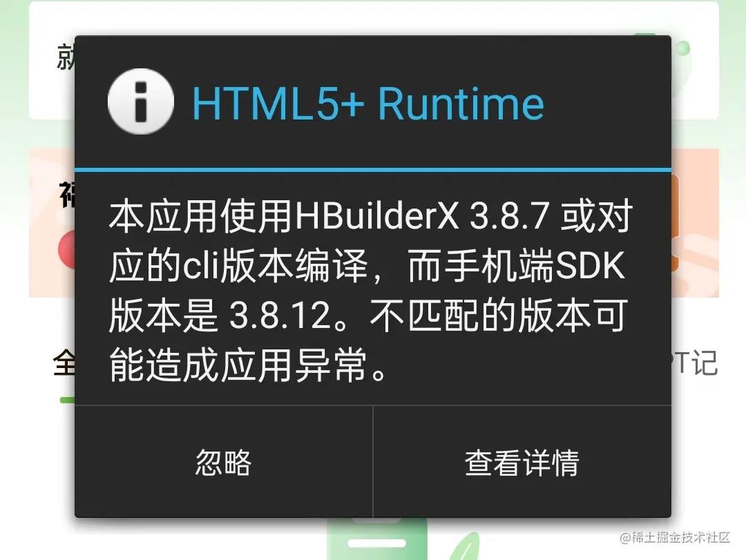 如果你需要用到 HBuilderX 安卓云打包,就必须及时跟进 HBuilderX 的版本更新,否则可能会因为编译时和运行时版本不一致而在APP运行时爆出提示,如果这个提示被用户看见,那就有点尴尬。