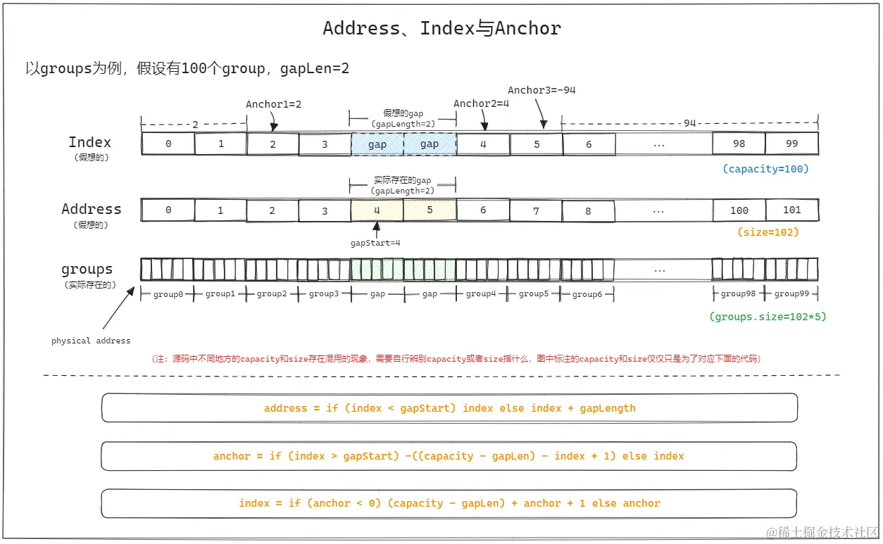 Index 和 Address 看起来比较好理解,从英文意思来看,都是索引位置的意思,Anchor 是锚点的意思,应该也是类似于索引位置,但是带有“标记”这层含义。而 Gap 则意为间隙。
