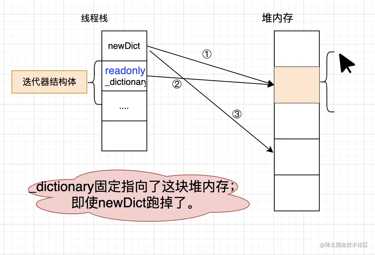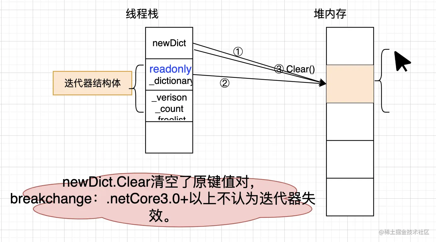 (2) 关键是迭代器使用的新的readonly Dictionary<TKey, TValue> _dictionary;字段指向了原newDict指向的对象。