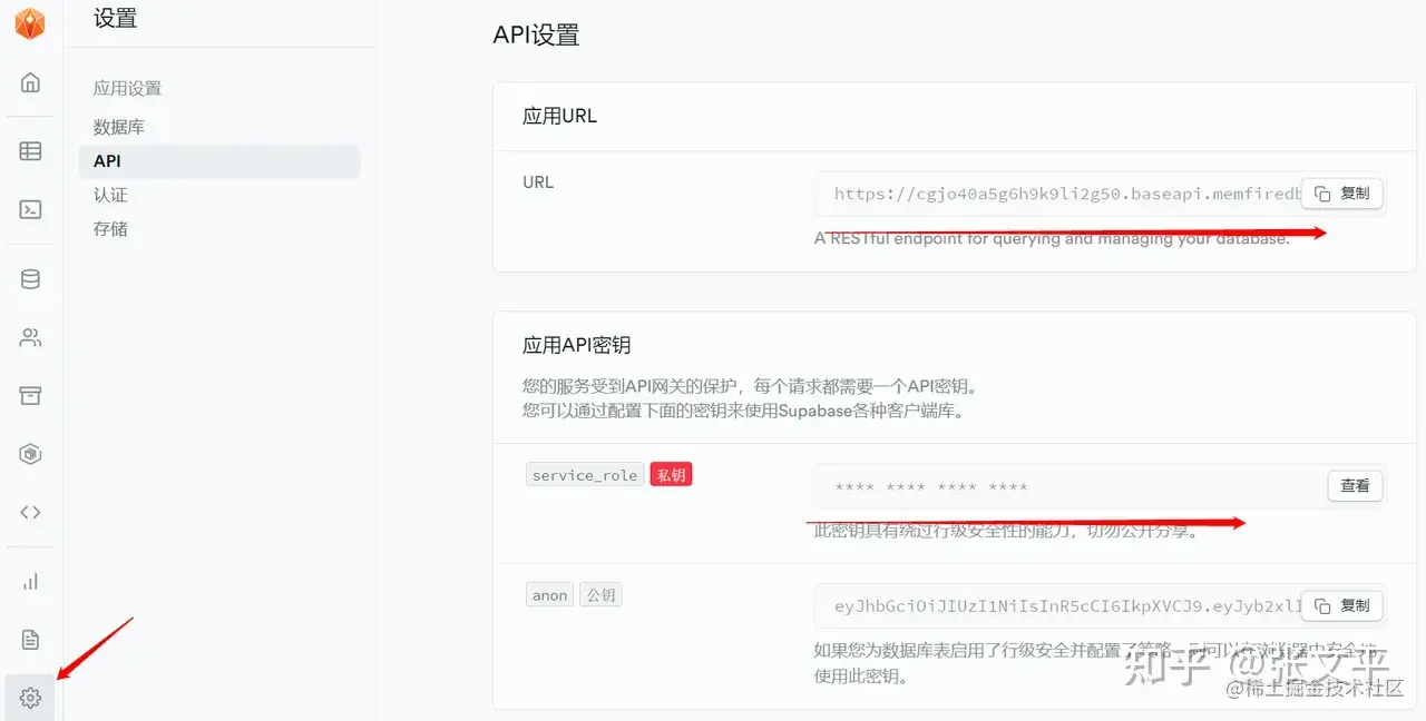 应用URL和service_role密钥。注意service_role秘钥具有比较高的数据库操作权限,只能用于服务端配置,不要泄漏。