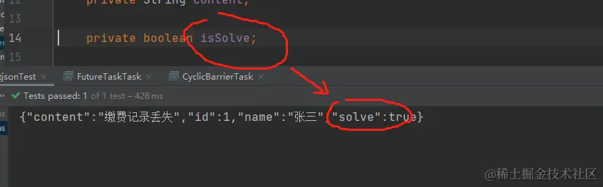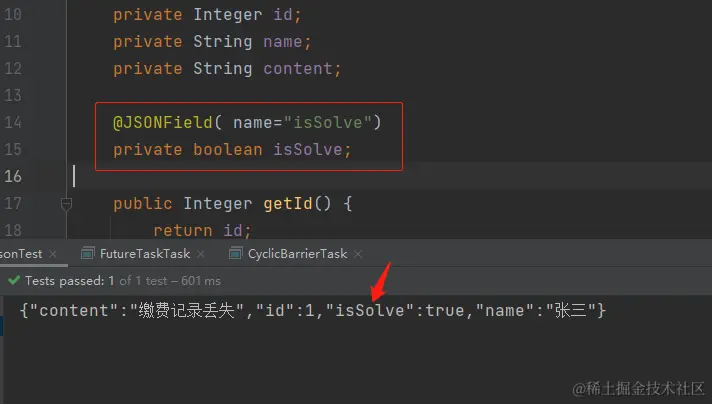 我们只需要在【isSolve】字段上加上该注解,并指定 key名为【isSolve】即可,代码演示如下: