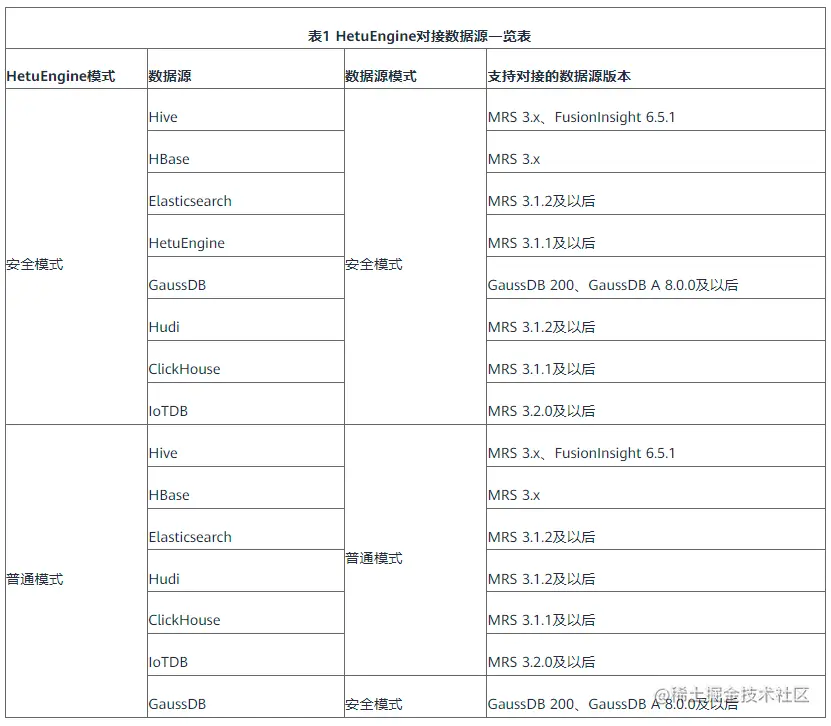 当前版本HetuEngine支持对接的数据源如表1所示