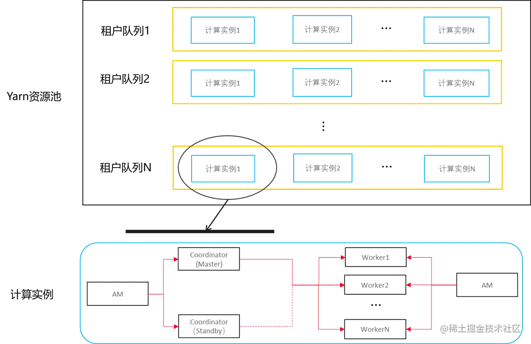 Yarn的租户队列、HetuEngine计算实例、计算实例的Coordinator 和 Worker 之间的关系如下图所示: