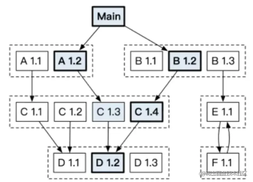如下图所示,某个项目依赖项目A和项目B ,且项目A、B分别依赖项目C的v1.3和v1.4版本。最终编译时,Go 所使用的项目C的版本为:v1.4 。