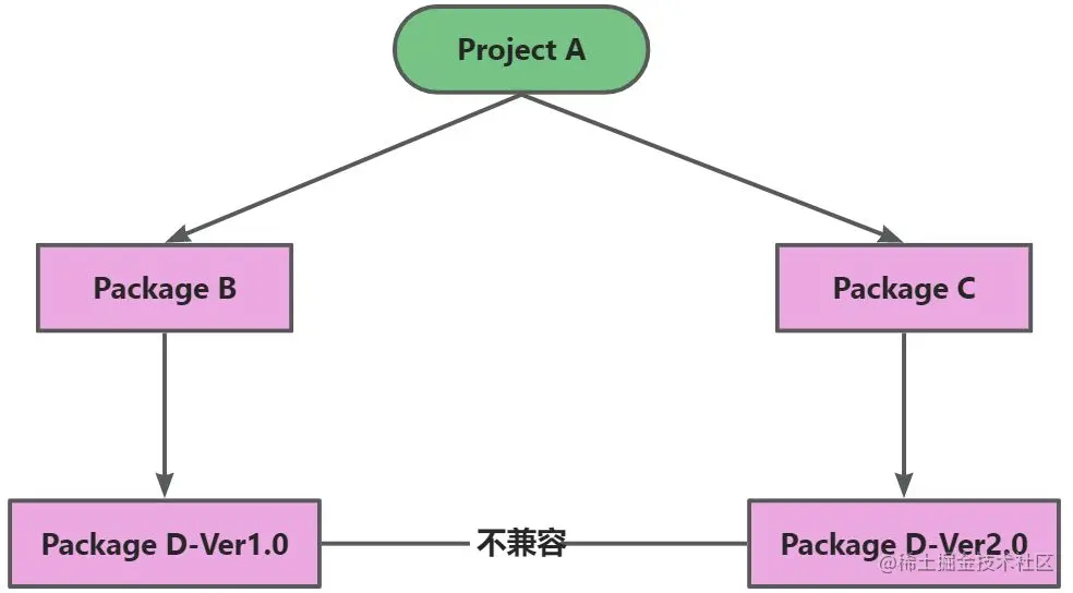 如图,项目A依赖pkg B和C,而B和C依赖了D的不同版本,通过Vendor的管理模式我们不能很好的控制对于D的依赖版本,一旦更新项目,有可能出现依赖冲突,导致编译错误。归根结底Vendor不能很清晰的标识依赖版本概念。于是Go Module应运而生。