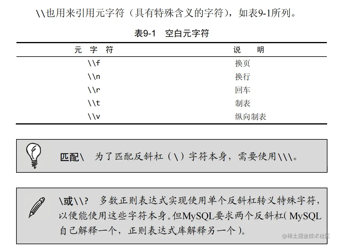 匹配特殊字符: SELECT prod_name FROM products WHERE prod_name REGEXP '\\.' ORDER BY prod_name;