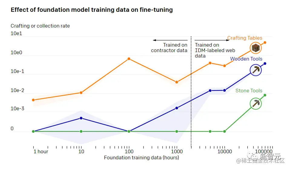 基础模型训练数据对微调的影响在训练了70000个小时以后,OpenAI的行为克隆模型就能实现其他模型做不到的工作了。比如,怎么砍树收集木头,怎么用木头做木条,怎么用木条做桌子。而这一套事儿需要一个比较熟练的玩家操作小50秒的时间。