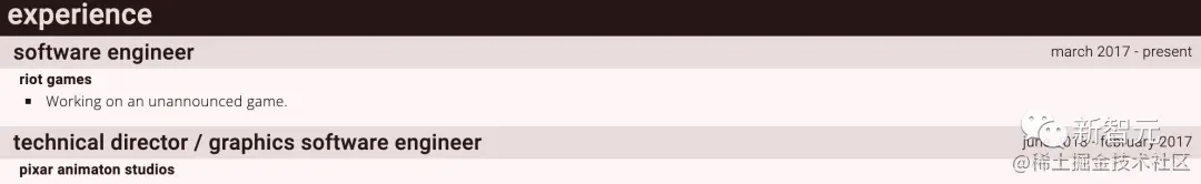 团队里唯一一位华人研究员,曾在Riot Games、Pixar致力于游戏动画的研究。他个人也是非常擅长实时渲染、基于物理渲染、以及Networked Gameplay。