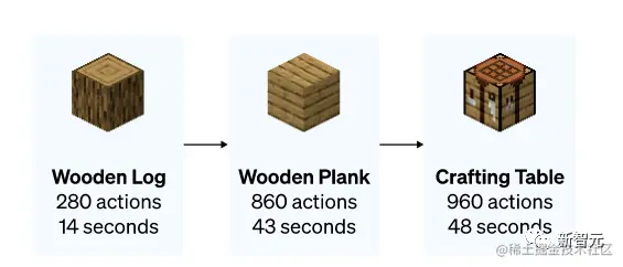 「跑跳搭」简陋版而难度更大的制作钻石镐,则需要一系列漫长而复杂的子任务。为了使这项任务易于处理,研究人员为序列中的每个项目奖励智能体。