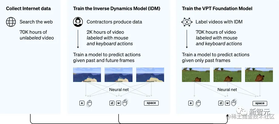 VPT方法概述然后,利用这些数据制作逆动力学模型(inverse dynamics model,IDM),从而推测出视频里每一步在进行的时候,键鼠都是怎么动的。这样,整个任务就变得简单多了,只需要比原来少很多的数据就可以实现目的。