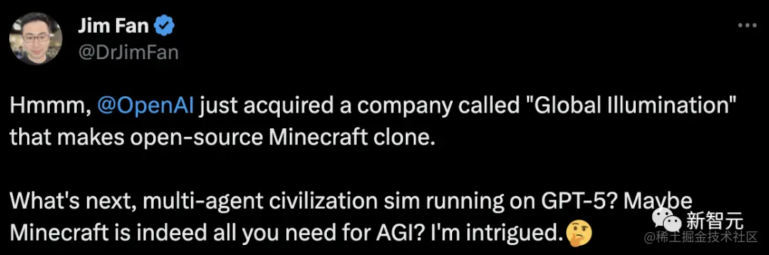 OpenAI收购这个动作暗示着什么?对此,英伟达高级研究科学家Jim Fan表示非常好奇:「下一步是什么?在GPT-5上运行多智能体文明模拟?也许「我的世界」就是打造AGI所需要的一切?」