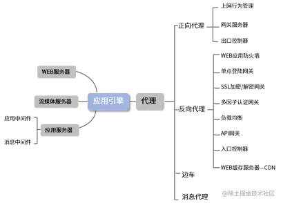 如上图所示,应用引擎产品形态包括 Web 服务器、流媒体服务器、应用服务器和代理服务器等。其中, 代理服务器又可分为正向代理、反向代理、边车和消息代理等产品。
