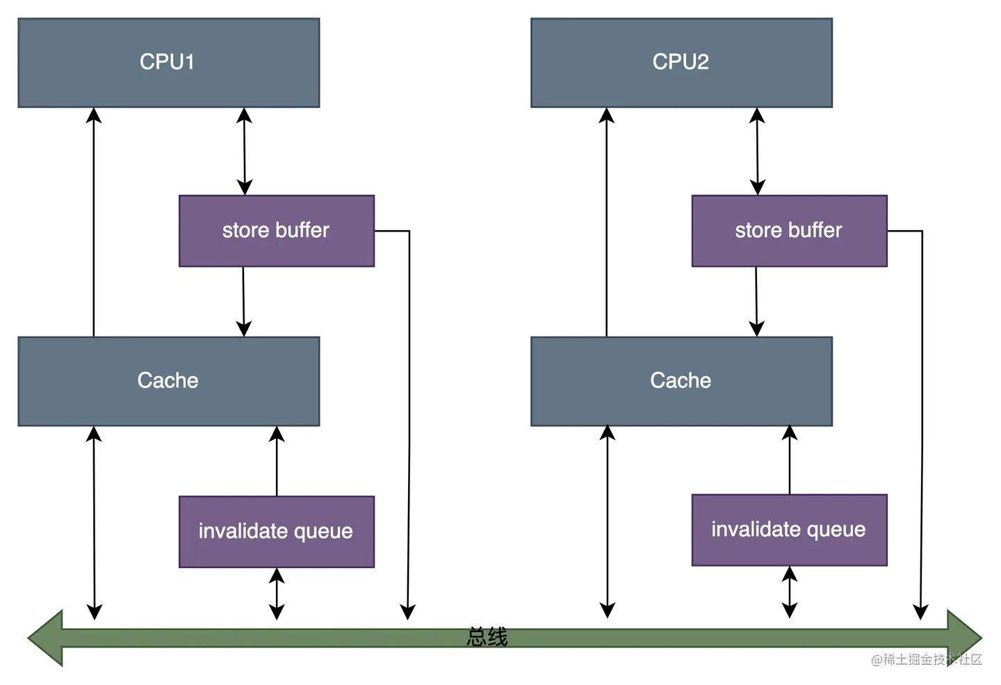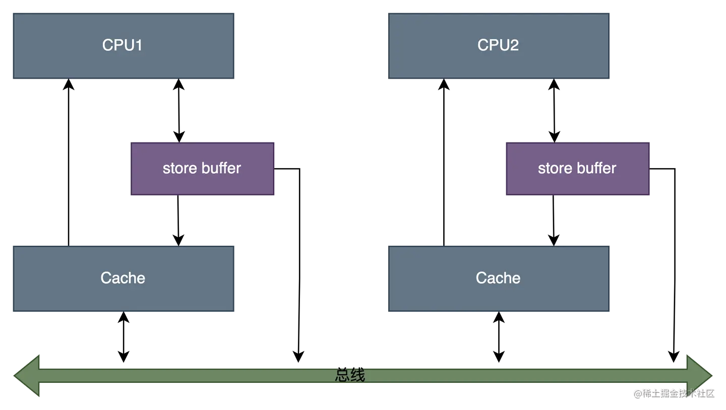 为了优化写操作性能,在CPU和Cache之间引入了store buffer,写操作时无需立即向其他CPU发送 invalidate 消息,而是先写入store buffer中,然后立刻返回执行其他操作,由 store buffer 异步执行发送广播消息,等到接收到其他cpu的响应后再将数据从store buffer移到cache line。