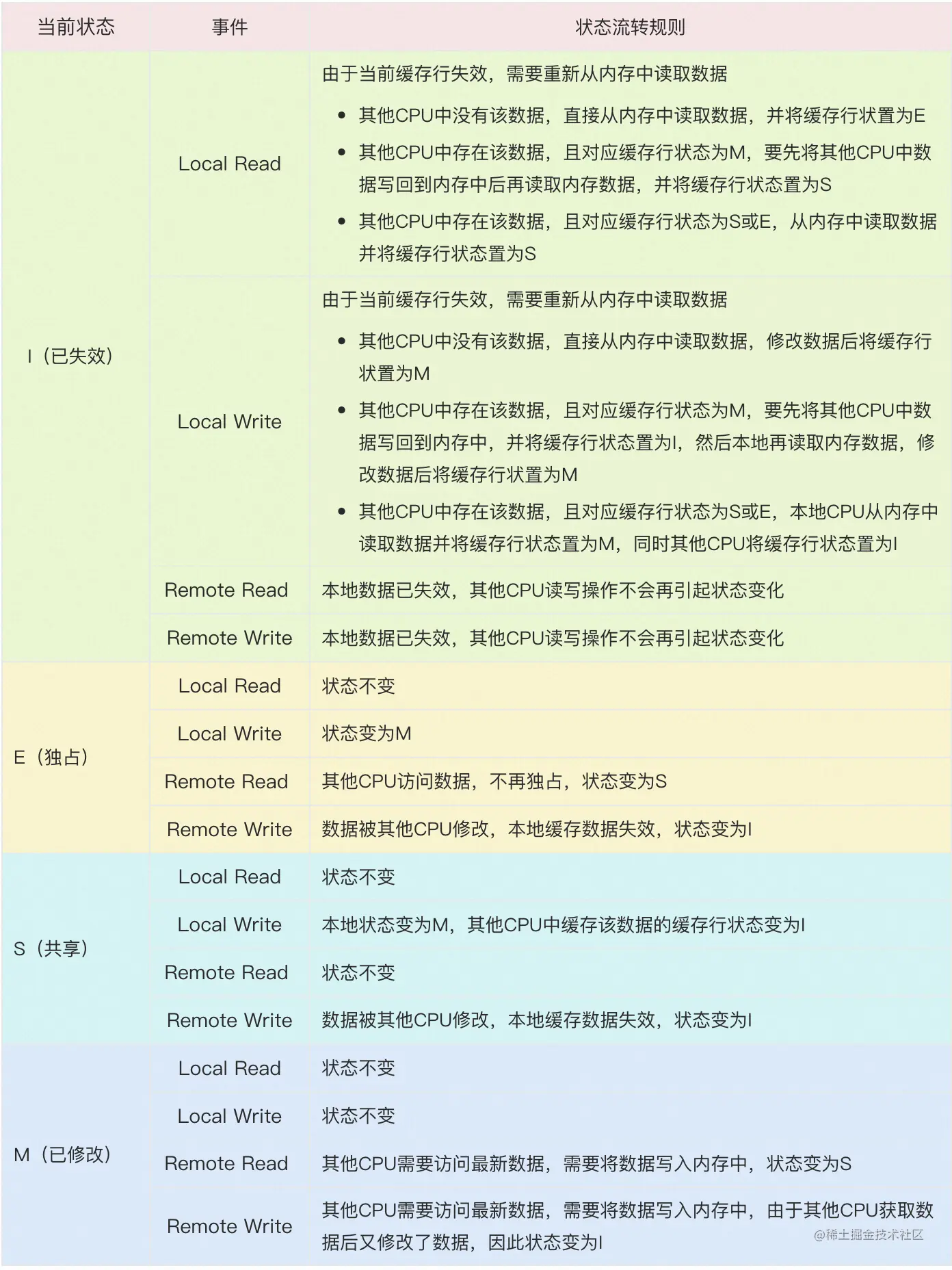 表注释:当前状态列表示缓存行的状态,事件列中Local Read / Local Write代表本地CPU的读写行为,Remote Read / Remote Write代表其他CPU的读写行为,状态流转规则描述了事件发生后缓存行状态将如何变化。