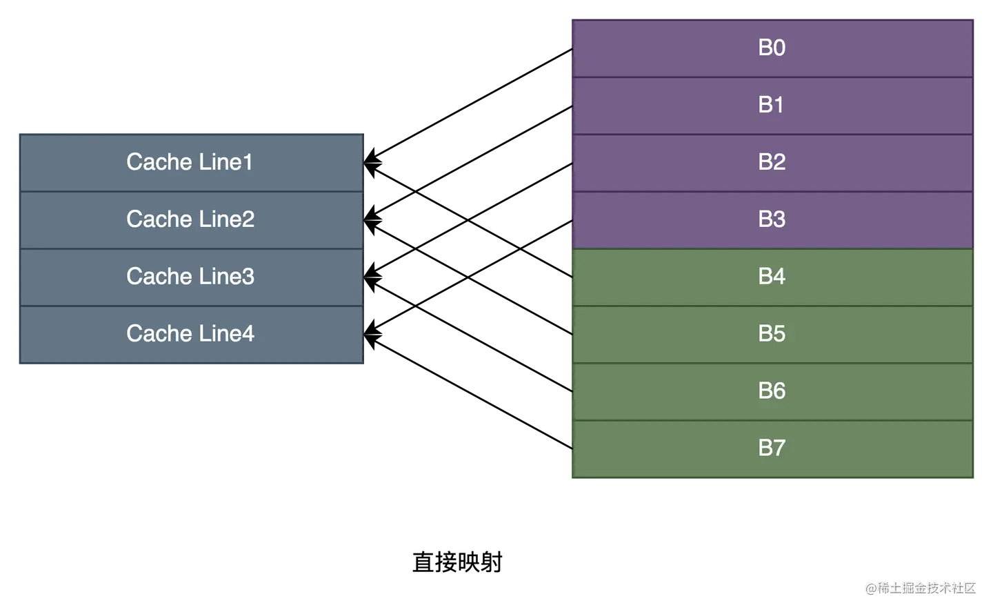 - 直接映射:直接映射中主存块按照缓存行数进行分组,如下图所示,缓存中有4个缓存行,因此每4个内存块划分为一组,每个组有自己的组号,每个组内的内存块有自己的块号,于是每一个主存地址由组号、组内块号(组索引)、块内偏移量三部分信息唯一标识。内存块按照组内块号取模映射到对应的缓存行,映射关系如下图箭头所示,因此在进行缓存数据访问时可以通过内存地址的组内块号直接映射到对应的缓存行。不同的内存块可能会映射到同一缓存行中,同一组的内存块不会映射到同一个缓存行,因此可以通过组号判断当前缓存行中数据是否为想要访问的数据,如果是的话则根据块偏移量获取缓存行数据中对应的字,否则从内存中读取。可见数据的缓存地址可以由组内块号(组索引)和块内偏移量唯一标识。