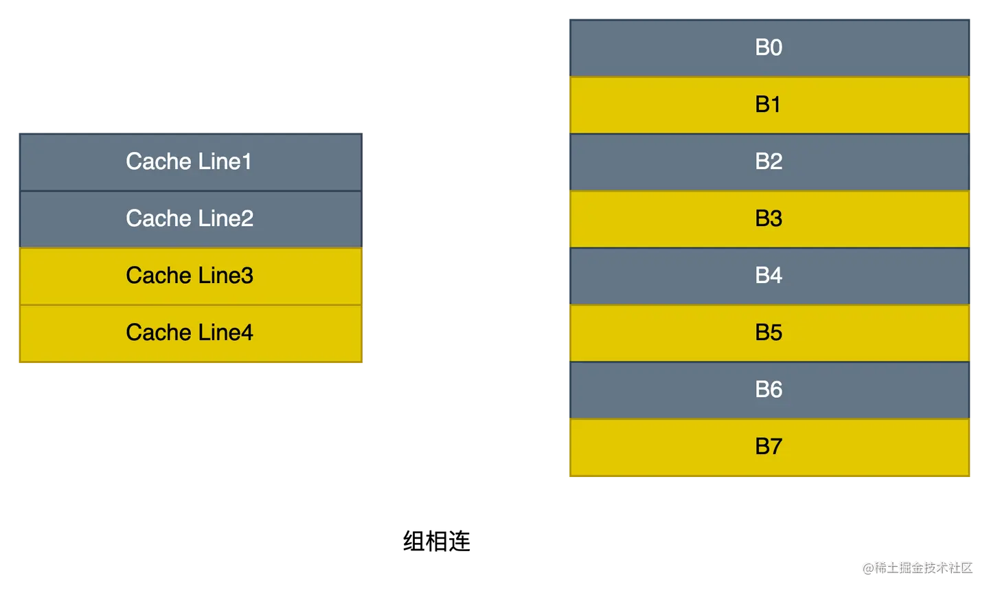 - 组相连映射:直接映射中每个内存块固定只能映射到一个缓存行中,块冲突概率高,为了缓解块冲突问题而产生了组相连映射。组相连映射中将缓存行和内存块都进行了分组,主存中每个组的内存块数与缓存行的分组数相同。同直接映射一样,主存地址可由组号、组内块号、块内偏移量三部分信息唯一标识。如下图所示,缓存行分成了两组(按颜色分组),于是每两个内存块分为一组(B0B1、B2B3...),内存组中的各内存块分别映射到某个缓存组中,最终可映射到缓存组内的任意缓存行中,即内存块映射到哪个缓存组仍然是固定的,但是映射到缓存组内哪个缓存行是任意的,如B0可以映射到缓存行1或缓存行2,B1可以映射到缓存行3或缓存行4,如下图内存块映射到相同颜色的缓存行。同直接映射一样,组相连映射中不同组的内存块可能会映射到同一缓存行中,同一组的内存块不会映射到同一个缓存组,这样避免了内存块只能映射到固定的缓存行的同时又具备一定的索引能力,在进行缓存数据访问时可以通过内存地址的组内块号直接映射到对应的缓存组,再遍历缓存组内的所有缓存行进行组号比对。如果命中缓存行则根据块偏移量获取缓存行数据中对应的字,否则从内存中读取。