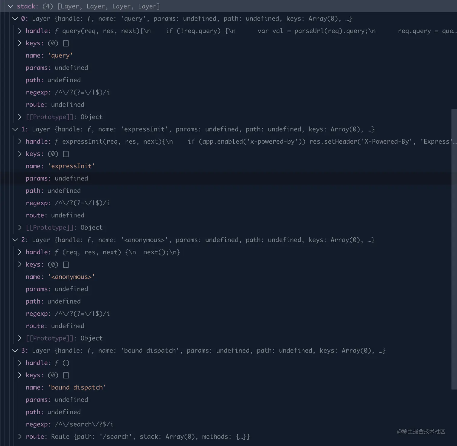 在这段精简后的逻辑中,我们可以看到,这个循环就是在stack中找到第一个匹配的layer,当match为true也就是匹配到的时候,则会跳出循环执行后面的逻辑。带入到我们的demo案例中,当我们发起了一个/search的请求时,实际在刚才stack中的四个layer都满足条件,由于前面两个是express内部的中间件,我们就从第三个layer的逻辑来思考。