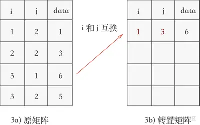 例如,将图 2a) 三元组表存储的矩阵进行转置的过程为: