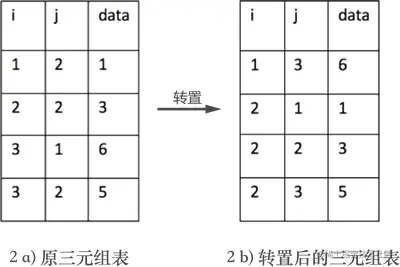 图 2a) 表示的是图 1 中转置之前矩阵的三元组表,2b) 表示的是图 1 中矩阵转置后对应的三元组表。
