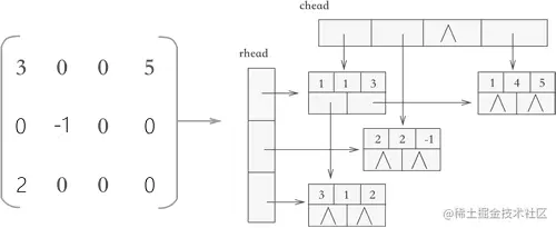 可以看到,使用十字链表压缩存储稀疏矩阵时,矩阵中的各行各列都各用一各链表存储,与此同时,所有行链表的表头存储到一个数组(rhead),所有列链表的表头存储到另一个数组(chead)中。