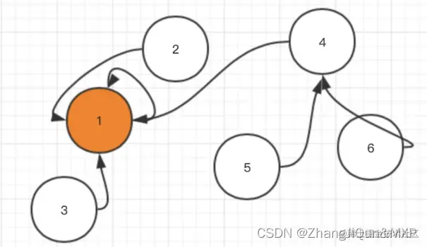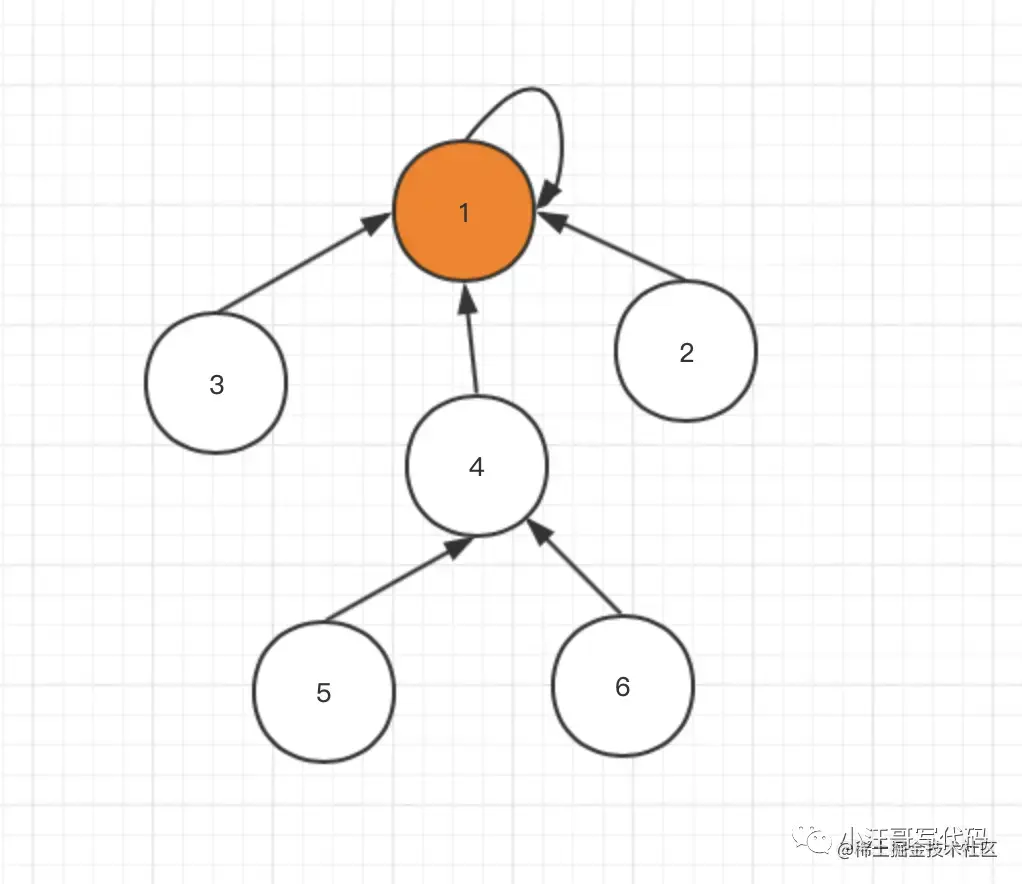 要寻找集合的代表元素(都城),只需要一层一层往上访问父节点(图中箭头所指的圆),直达树的根节点(图中橙色的圆)即可。