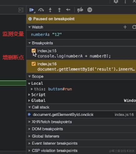 下面几个功能分别是:作用域列表、调用栈、网络请求断点、HTML元素变化时断点...