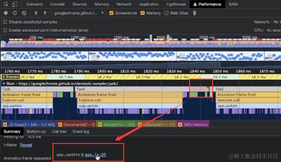 如下图所示,右上角的红色小三角表示可能遇到性能瓶颈,通过查看下面的面板可以定位到可能导致性能差的代码位置。