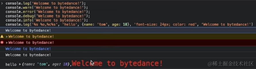 console.logconsole.warn / console.error / console.debug / console.infoconsole.table(dataArray)用表格的形式具象化地展开JSON和数组数据console.dir通过类似文件树的方式展示对象的属性console.time- 占位符:给日志添加样式,可以突出重要的信息。