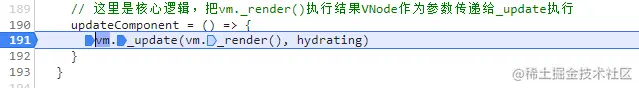 // 这里是核心逻辑,把vm._render()执行结果VNode作为参数传递给_update执行