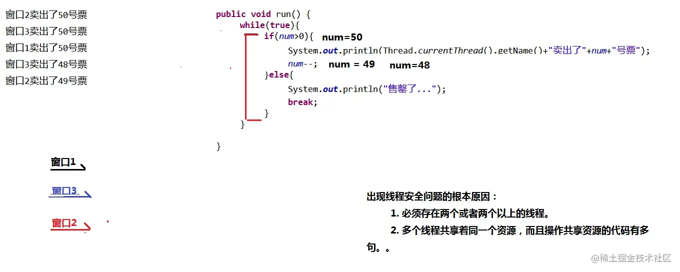 System.out.println(Thread.currentThread().getName()+"卖出了"+num+"号票");