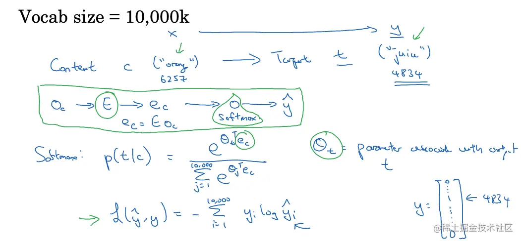 假设我们有一个包含10000个词的词汇表。我们要学习的是如何从某个上下文词映射到某个目标词。为了表示输入(例如单词“orange”),我们可以使用一个one-hot vector,然后乘以嵌入矩阵E,得到输入上下文词的嵌入向量。我们将这个向量馈入到一个softmax单元,得到输出y_hat。然后我们就可以通过softmax的损失函数优化所有的这些参数,得到一组好的嵌入向量。