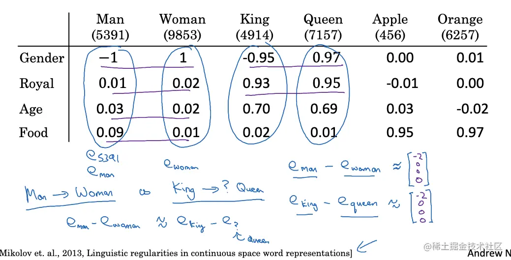 词嵌入可以帮助理解和建立类比关系,我们看下面这张表: