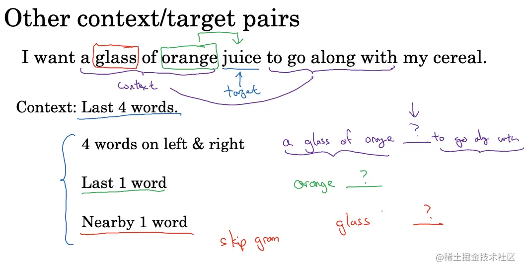 我们的问题不像是前一个通过前面单词预测下一个单词,而是根据目标词的左右四个词类预测中间的词,这种方法也可以用来学习词嵌入。另外还有更简单的学习问题,比如通过“juice”反向预测“orange”,也可以得到很好的结果。