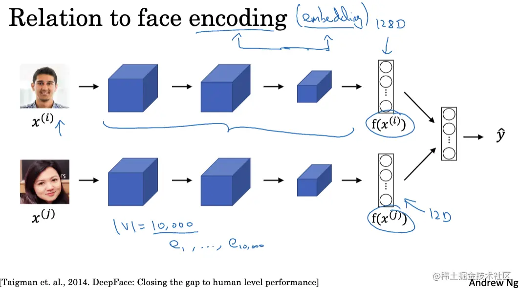 词嵌入和face encoding有一些相似之处。在面部识别中,我们会训练一个网络来学习一个128维的表示。然后,我们可以比较这些编码来判断这两张图片是否是同一张脸。在词嵌入中,我们也会学习一个固定的词嵌入,例如,我们可能会有一个固定的词汇表,包含10000个单词,我们会为每一个单词学习一个词嵌入。
