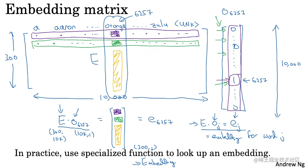 在学习词嵌入的过程中,这种通过使用嵌入矩阵和one-hot vector 提取特定词的嵌入的方式是非常重要的。