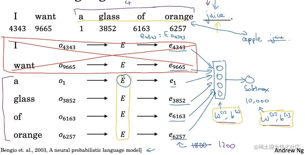 依然举个例子来辅助说明,假设我们需要使用神经网络构建一个语言模型,这个模型可以实现输入一句话然后预测序列的下一个单词,如"I want a glass of orange (juice)."