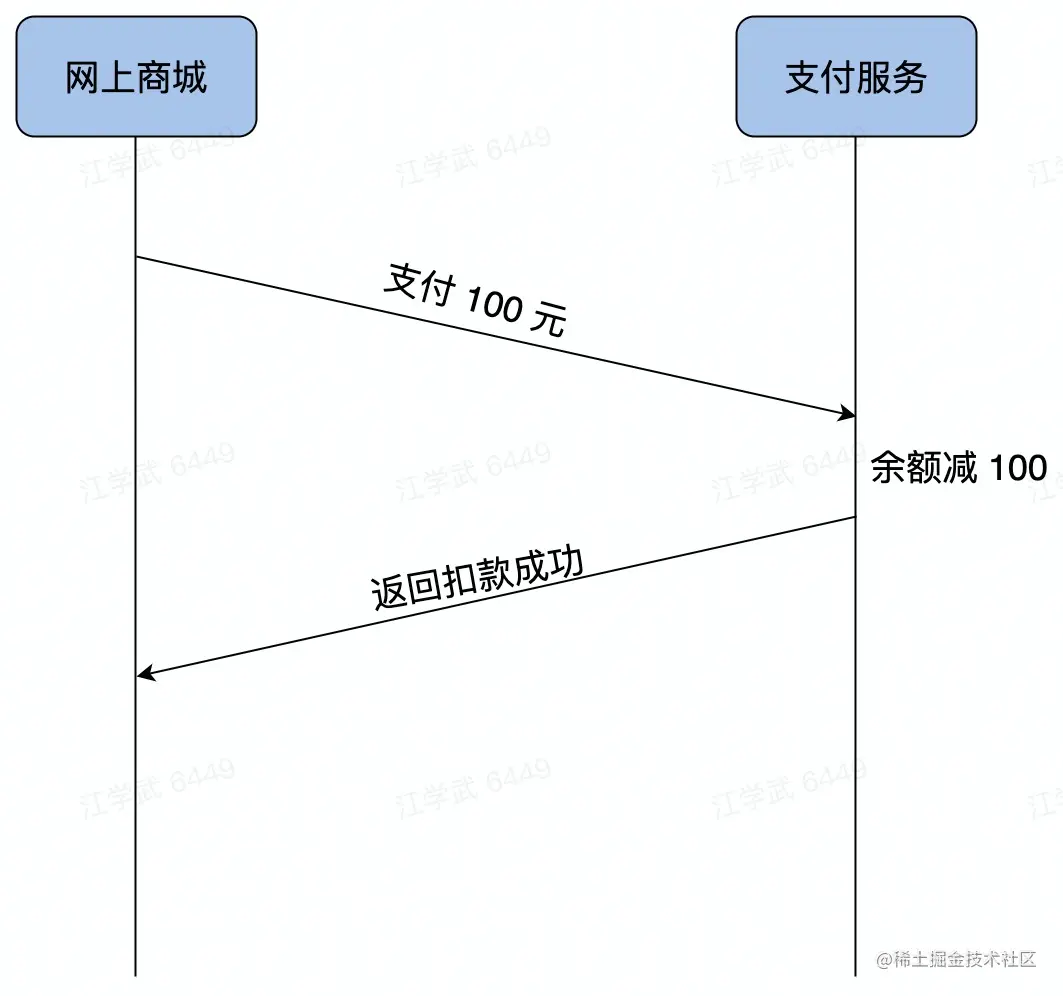 比如双十一时我们在网上购物,有一个付款的操作。比如付款的时候要支付100块钱,那就需要调用一个支付服务。支付服务就会进行一些操作(把余额减100),最后返回一个code,提示付款成功的信息。