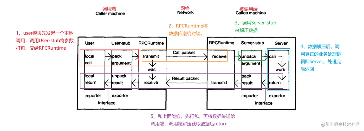1984年 Nelson 发表了论文《lmplementing Remote Procedure Calls》,其中提出了 RPC 的过程由 5个模型组成: User、User-Stub、RPC-Runtime、Server-Stub、Server。