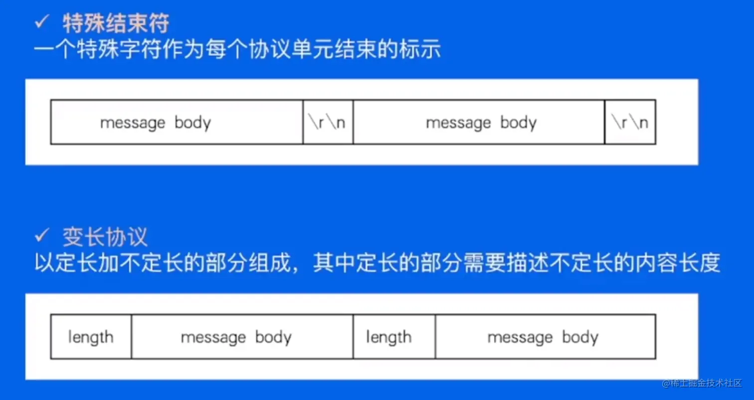 特殊结束符的协议是设定专门的标志位来标识结束的位置。比如HTTP协议就以回车+换行来作为特殊结束符。定长协议用一个Length来描述后面真正的消息体的长度。通过这个指定的长度值,也能知道读取的时候应该在哪里结束。