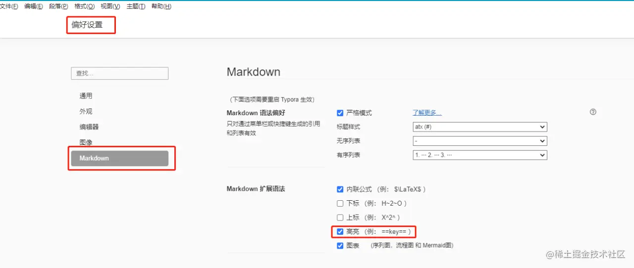 注意,第一次使用 Typora 时,高亮是默认不显示的。我们需要在 文件 -> 偏好设置中勾选开启高亮: