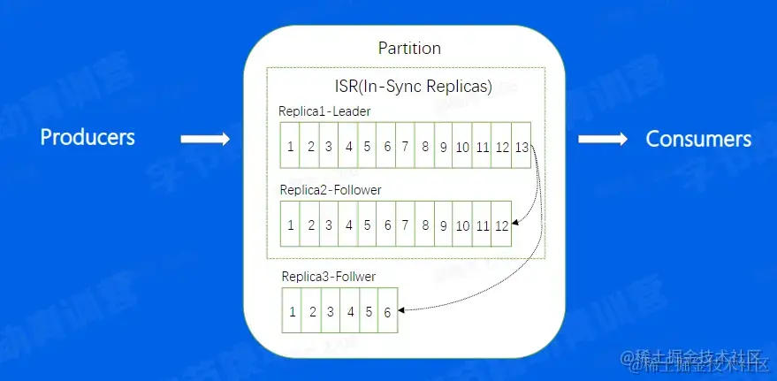 ISR:意思是同步中的副本,对于Follower来说,始终和leader是有一定差距的,但当这个差距比较小的时候,我们就可以将这个follower副本加入到ISR中,不在ISR中的副本是不允许提升成Leader的