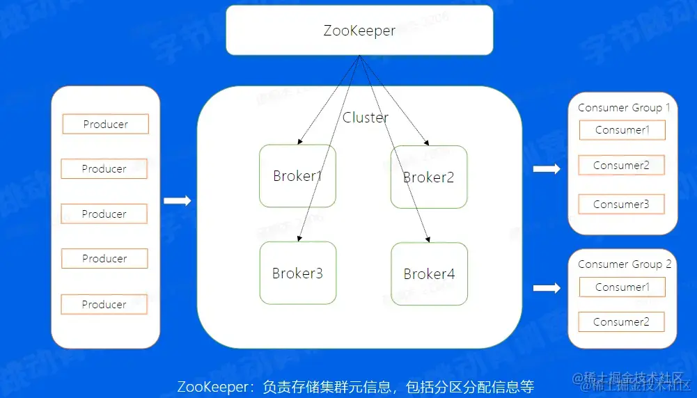 而在集群的基础上,还有一个模块是ZooKeeper,这个模块其实是存储了集群的元数据信息,比如副本的分配信息等等,Controller计算好的方案都会放到这个地方