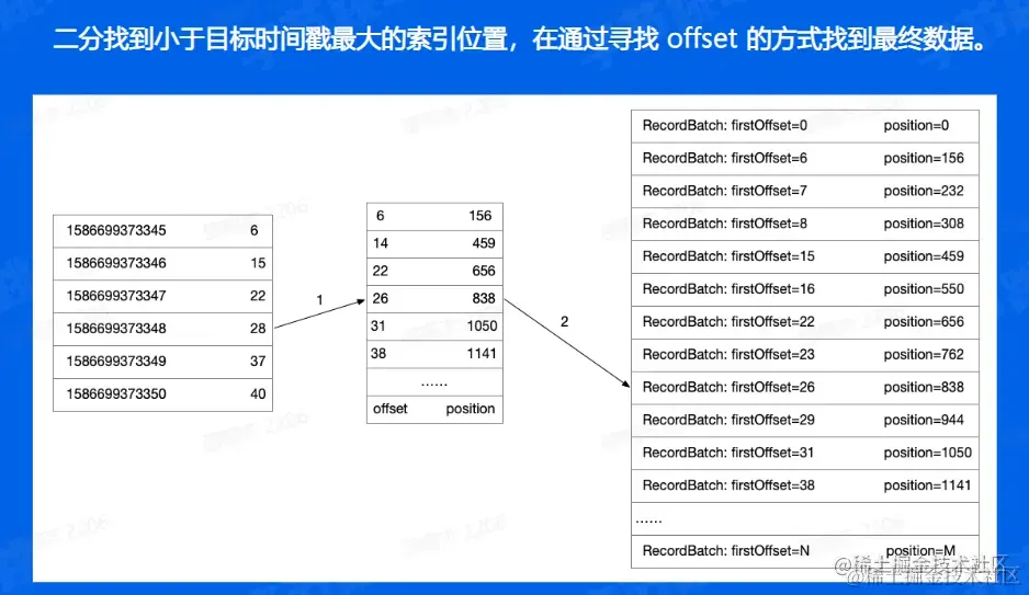 如果我们需要使用时间戳来寻找的时候,和offset相比只是多加了以及索引,也就是通过二分找到时间戳对应的offset,再重复之前的步骤找到相应的文件数据