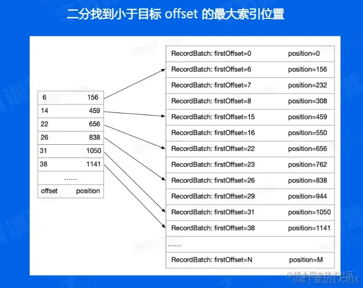 通过二分找到小于目标offset最大的索引位置,再遍历找到目标offset