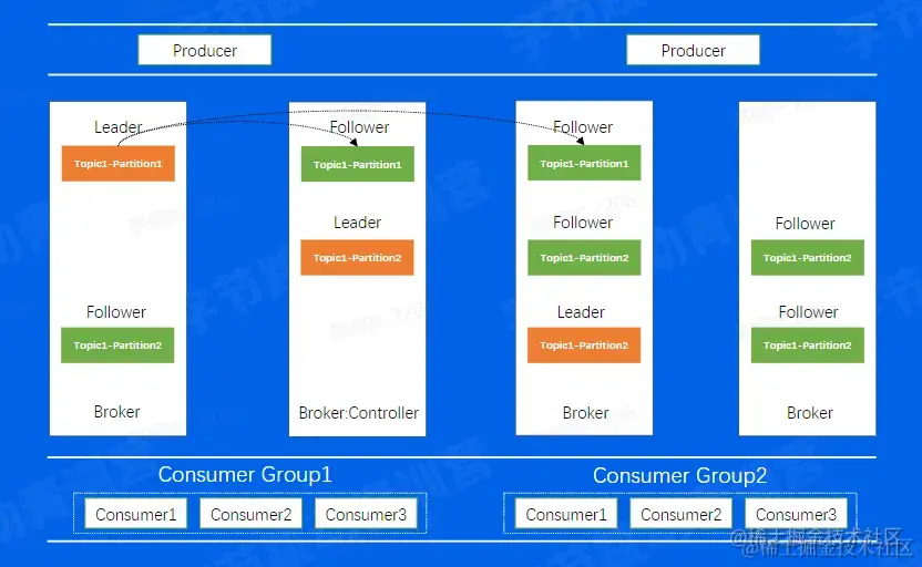 图中Broker代表每一个Kafka的节点,所有的Broker节点最终组成了一个集群。 图中整个集群,包含了4个Broker机器节点,集群有两个Topic,分别是Topic1和Topic2,Topic1有两个分片,Topic2有1个分片,每个分片都是三副本的状态。这里中间有一个Broker同时也扮演了Controller的角色,Controller是整个集群的大脑,负责对副本和Broker进行分配。