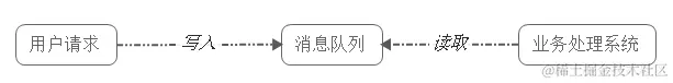 - 请求先入消息队列,而不是由业务处理系统直接处理,做了一次缓冲,极大地减少了业务处理系统的压力;