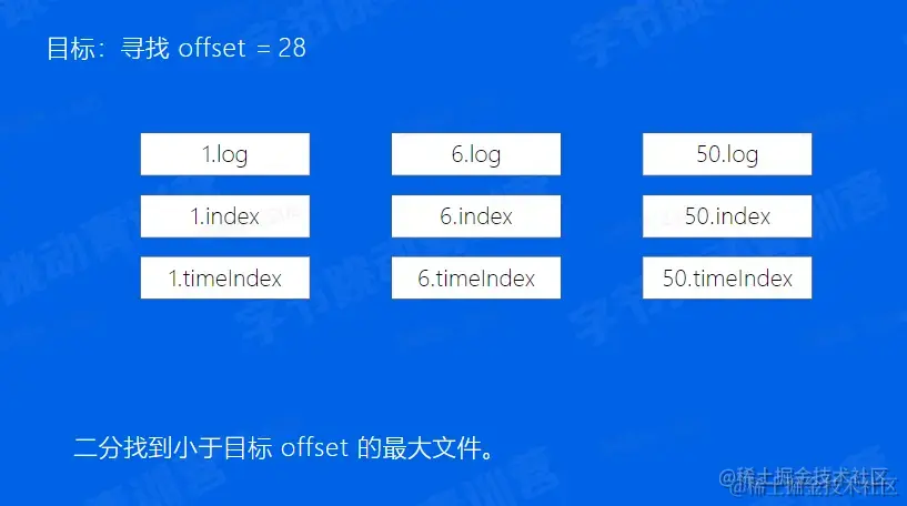 Broker偏移量索引文件: 介绍文件:文件名是文件中第一条消息的offset 然后,第一步,通过二分找到小于目标文件的最大文件