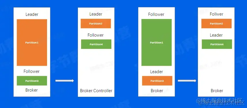 这个场景当中,同一个Topic有4个分片,两副本,可以看到,对于分片1来说,数据量是明显比其他分片要大的,当我们机器IO达到瓶颈的时候,可能就需要把第一台Broker上面的Partition3迁移到其他负载小的Broker上面,接着往下看