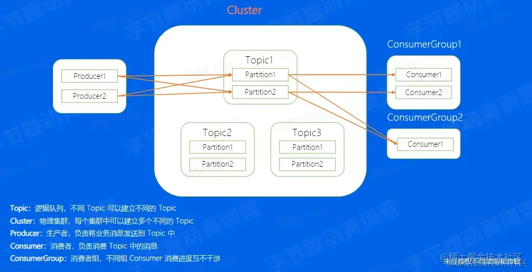 - Cluster:Kafka的物理集群,每个集群中可以新建多个不同的topic