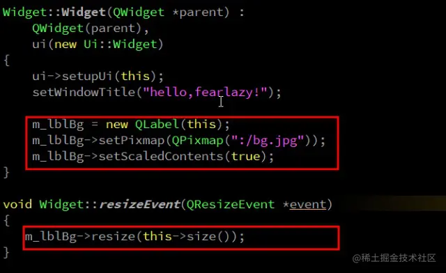 创建一个label作为Widget的子窗口,然后设置图片。通过在Widget的resizeEvent事件中设置label的大小与Widget一致。这里需要注意调用QLabel的setScaledContents(true),否则效果和第一种一样。由于QLabel可以用来显示动图因此使用这种方式可以实现窗口的动态背景图片。
